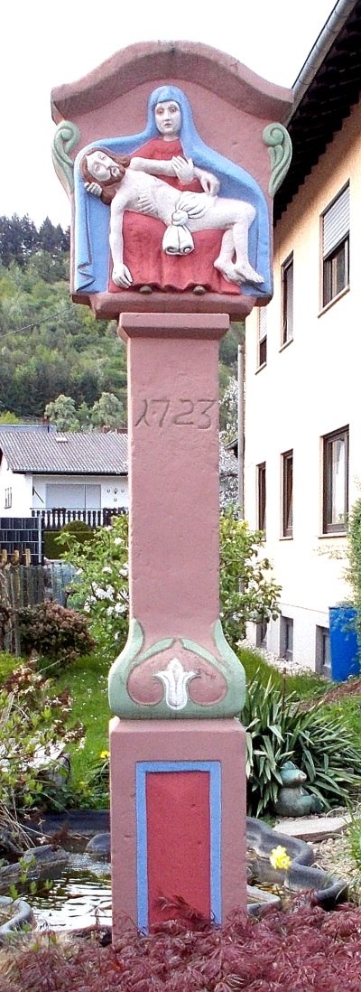 Bildstock, bezeichnet 1723. Der (erneuerte?) Aufsatz mit geschwungenem Abschluß und Pietàrelief. [1]
