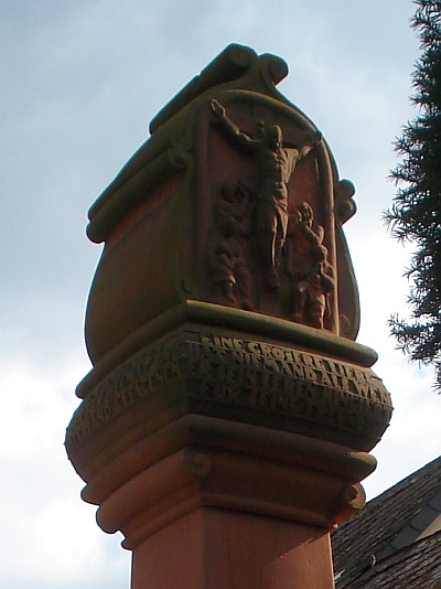 Westlich der Kirche das Kriegerdenkmal des Ersten Weltkrieges in Form eines großen barocken Bildstockes mit Kreuzigungsrelief. [1]