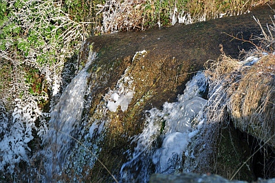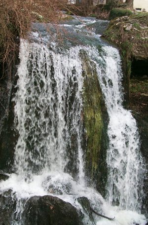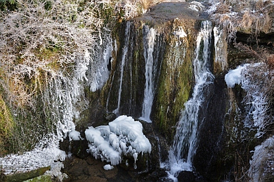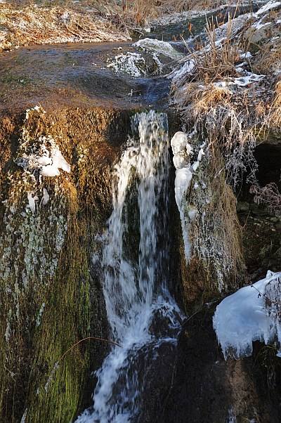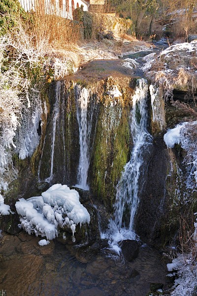 Die Fotos vom Februar 2012 zeigen den etwa 4,50 m hohen Hüttinger Wasserfall an der Hauptstraße bei der Kirche. Das Wasser ist heute noch trinkbar, da die Quelle in einem ehemaligen Steinbruch und Waldgebiet stammt. [1]