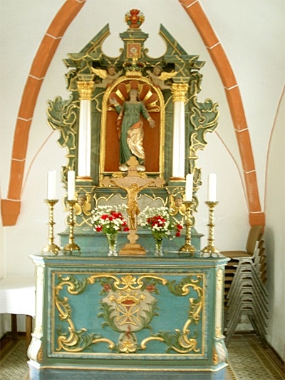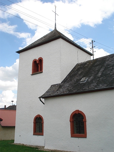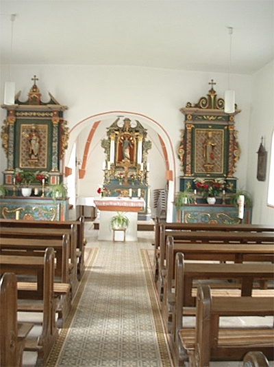Kleiner, zweiachsiger Saalbau mit zweigeschossigen Ostturm. Zumindest letzterer noch mittelalterlich, wie die gekuppelte rundbogige Schallöffnung im Glockengeschoß und das steile Kreuzgratgewölbe im Chorraum zeigen. Die auch am Schiff rundbogigen Fenster mit betonten Kämpfer – und Scheitelsteinen stammen von einer eingreifenden Instandsetzung im 18. Jh., bei der möglicherweise das flachgedeckte Schiff ganz neu gebaut wurde. Auf dem Turm flaches Zeltdach des 19. Jh. Von der älteren Ausstattung sind drei Holzaltäre des 18. Jh. erhalten.