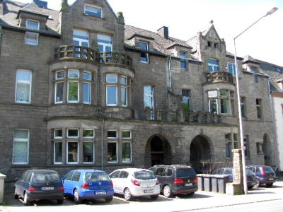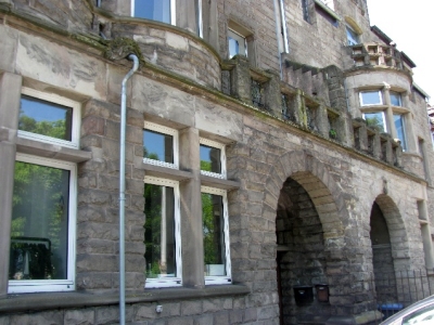 Doppelvilla; mit bossierten Sandsteinquadern verkleidete Fassade mit Motiven der monumentalisierenden Neuromanik, des Sezessionsstils und der Reformarchitektur, 1900, Architekt Peter Marx. [1]
