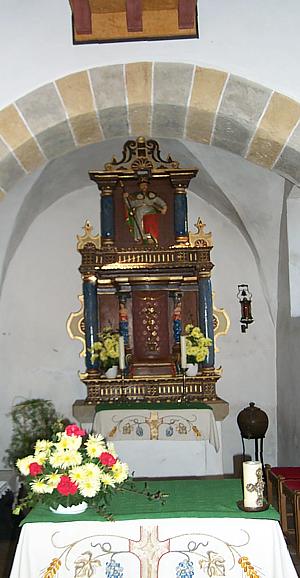 Ein gemauerter Altarblock mit einem Monolith als Altarstein trägt ein zweigeschossiges Retabel der späten Renaissance. Im Untergeschoss enthält dies den Tabernakel, im verjüngten Obergeschoß eine Figur des heiligen Jakobus mit seinen Arttributen, dem Pilgerstab und den Jakobsmuscheln. Der Seitenaltar an der südlichen Ostwand des Schiffes trägt ein barockes kleines Altarretabel, das aus zwei säulengerahmten Nischen besteht. In ihnen haben Terrakottafiguren des auferstandenen Christus und des drachentötenden Erzengels Michael aus der Zeit um 1900 Platz gefunden. An der Nordwand des Kirchenschiffs befindet sich ein Ölgemälde auf Holzplatten, das ursprünglich zu einem Altar gehörte und die heilige Margarete und die heilige Barbara darstellt. Nach der Widmungsinschrift wurde es 1644 gestiftet. 1985 erfolgte eine Restaurierung des Inneren und Äußeren.