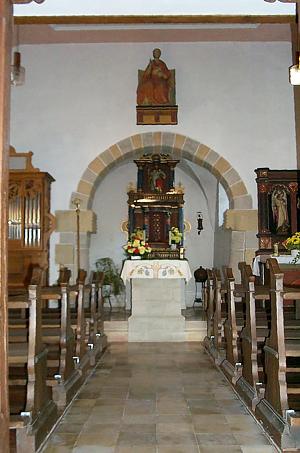Der Raumeindruck im Inneren wird bestimmt vom wuchtigen romanischen Triumphbogen, in dessen Laibungen halbrunde Pfeiler mit Kapitellen und mächtigen Kämpfersteinen sitzen. Kämpfer, Kapitelle und Basen sind mit Taustäben beziehungsweise wulstigen Rundstäben