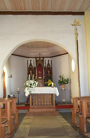 Das Innere des flachgedeckten Saales birgt einen neugotischen Baldachinaltar mit noch original gefassten Terrakotta-Plastiken der Muttergottes und desJosef vom Ende des 11. Jahrhunderts, eine gotische Holzmadonna mit Jesuskind aus der ersten Hälfte des 15. Jahrhunderts und eine barocke Steinfigur des Kirchenpatrons in Pontifikaltracht. [1]