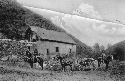 Das Foto zeigt die Mühle um 1900. Die Manderscheider Familie de Leuw machte mit Kutsche und zu Roß einen Ausflug zur Meerfelder Mühle.