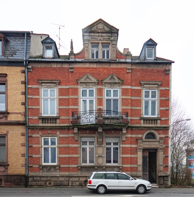 Anspruchsvolles Zeilenwohnhaus, sandsteingegliederter Klinkerbau, Neurenaissance, bezeichnet 1895, rückwärtige Erweiterung, Reformstil, 1908; Ausstattung. [1]