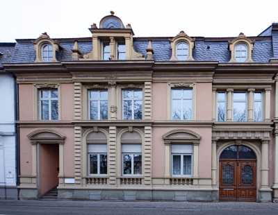 Gründerzeitliches Zeilenwohnhaus, sandsteingegliederter Mansarddachbau. [1]