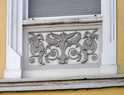 Der Ladeneinbau im Erdgeschoss erfolgte 1908. Die reliefierten Brüstungsfelder unter den Fenstern des ersten Obergeschosses, die lisenenartige Rahmung der beiden Fassaden und der Rundbogenfries unter der Traufe lassen das höhere Alter des Baues erkennen. [2]