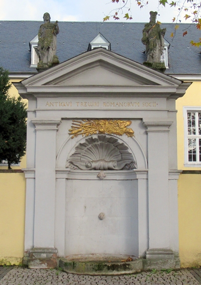 Der aus der Barockzeit (Mitte 17. Jahrhundert oder um 1700) stammende Brunnen in der ersten Hälfte des 19. Jahrhunderts überformt. Die Farbfassung um 1982. Die Rahmenarchitektur in Form eines Renaissance-Tabernakels mit seitlichen Pilastern, Gebälk- und Dreiecksgiebel, darin die Inschrift ANTIQVI TREUIRI ROMANORVM SOCII. Seitlich über dem Giebel die Sandsteinfiguren von Romulus und Trebeta angeordnet, die sagenhaften Gründer von Rom und Trier (Kopien von 1979, die Originale im Treppenhaus der Staatsanwaltschaft, Dietrichstraße 13).