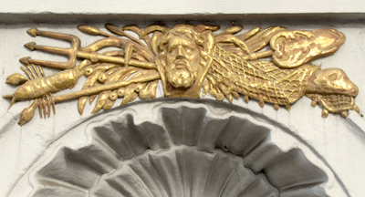 Die rundbogige Brunnennische zeigt in der Kalotte prächtiges Muschelwerk, darüber detailliertes Relief mit Neptunhaupt. [2]