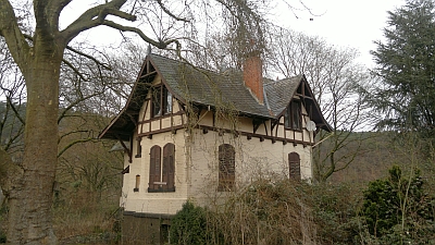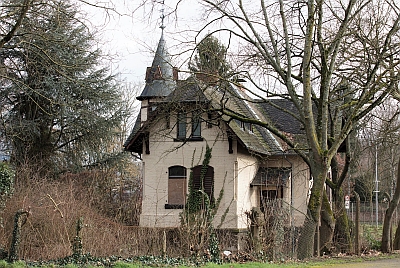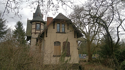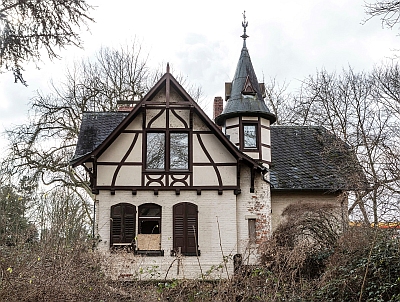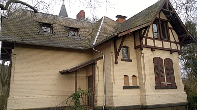 Malerisch verschachtelter, kleiner eingeschossiger Backsteinbau mit Fachwerkkniestock und kleinem Rundturm, 1900. [1]