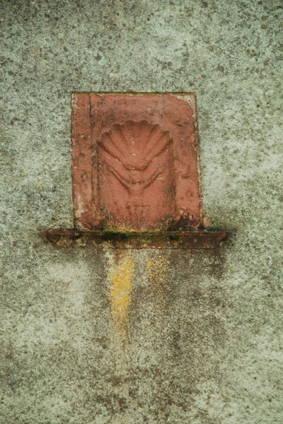 Ungewöhnlich ist die Verbindung mit einem Kruzifix, das mit der Nische aus einem Stück gearbeitet ist. Der Muschelabschluss erinnert an die Jakobusmuschel.
