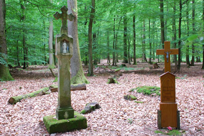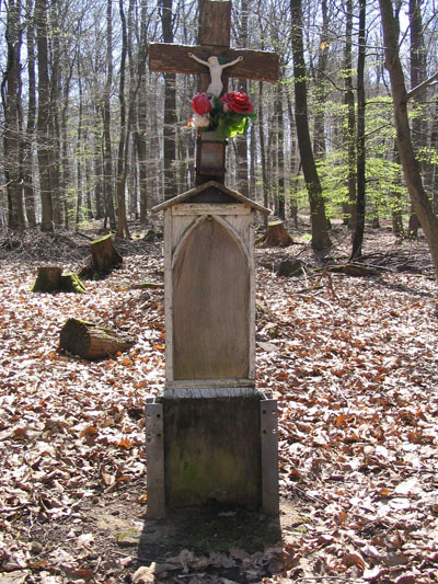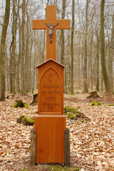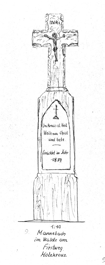 Neben dem Firstkreuz [s. Datensatz stand ein kleines Holzkreuz aus dem Jahre 1879. Es war mehr als Schaftkreuz gearbeitet. Die Inschrift unterhalb des Abschlusskreuzes lautete: "Weile mein Christ und bete", eine häufig im unteren Saartal anzutreffende Redewendung.