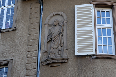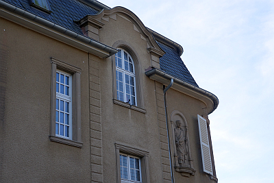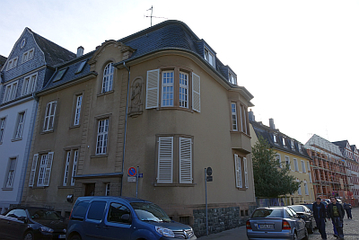 An der Ecke zur Alkuinstraße 1911 nach Plänen des Architekten Julius Wirtz im Auftrag des (ehemals an der Balthasar-Neumann-Straße gelegenen) Klosters zum Guten Hirten errichtet für den Rektor der Bewahr- und Besserungsanstalt des Klosters. [...] Im ersten Obergeschoss in Sandstein Figur des heiligen Palmatius in flacher Halbrundnische. Im Eingangsflurteppichartige Bodenfliesen mit geometrischem Jugendstildekor. Den Straßenraum bewusst gestaltendes Gebäude. [1]