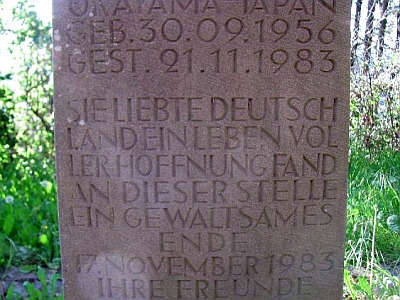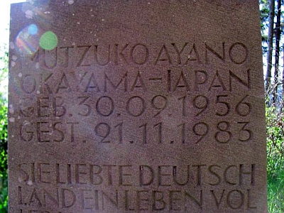 Nach dem Verbrechen an der japanischen Studentin Mutsuko Ayano, stiftete der Rotary-Club im Jahr 1984 seiner Stipendiatin einen Gedenkstein. Dieser wurde nach den Vorschlägen ihrer Eltern vom Trierer Bildhauer Jupp Zimmer (1919–1995) in schlichtem Sandstein angefertigt und in der Straße des Geschehens aufgestellt. [1]