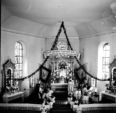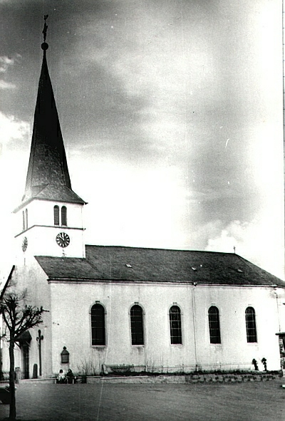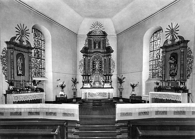 Die Fotos 1 und 2 zeigen Außen- und Innenansicht der Kirche vor 1960. Der alte Kirchturm blieb erhalten und wurde in den 1964 errichteten Neubau integriert. Das dritte Bild wurde 1953 aus Anlaß des 25jährigen Priesterjubiläums von Dechant Josef Raskop aufgenommen. [1].