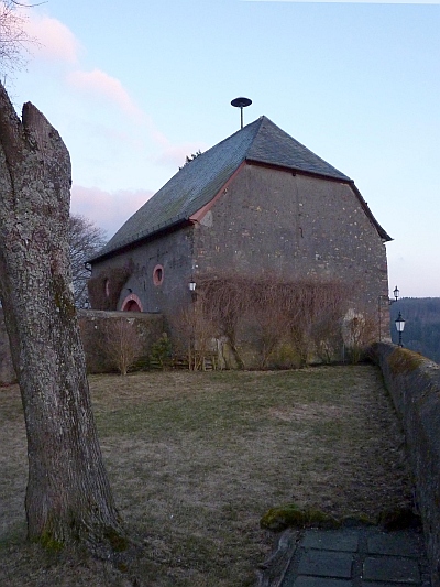 Die Dauner Burgscheune steht auf einem Basaltfelsen, mitten im Stadtzentrum, neben dem Kurfürstlichen Amtshaus und der evangelischen Kirche.