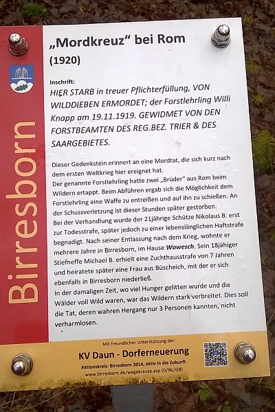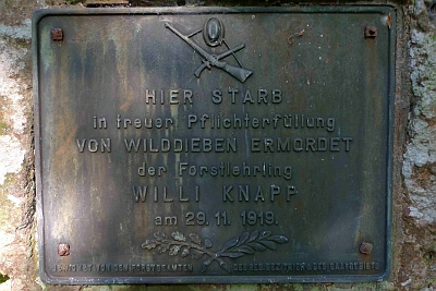 Am ersten Waldweg, der von der K 78 Richtung Birresborn unterhalb Roms nach rechts abzweigt, findet man nach etwa 150 m ein quaderförmiges, hochkant stehendes Natursteindenkmal, eingefaßt von kleineren Lavasteinen. Ein leicht ansteigender, treppenförmig angelegter Steg führt dorthin. Im oberen Drittel ist eine gußeiserne Platte mit der Inschrift angebracht: "Hier starb in treuer Pflichterfüllung von Wilderern ermordet der Forstlehrling Willi Knapp am 29.1 1.1919.