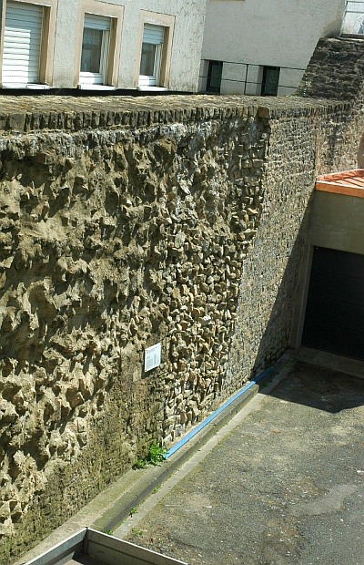Die höchsterhaltenen Reste der römischen Kastellmauer können beim Durchqueren der Murengasse zum Parkplatz am Rathaus besichtigt werden. Hier ist der vorhandene Mauerkern ca. 5 bis 6 m hoch. An der Außenfront ist eine Verblendung aus Kalksteinquadern erkennbar, während der Zwischenraum mit einer Masse aus Kalkmörtel und unregelmäßigen Bruchsteinen gefüllt wurde. Die ursprüngliche Außenfront ist jedoch nur noch in kleinen Teilen unterhalb des Rathauses erkennbar. In weitaus größeren Abschnitten ist das Material der inneren Verblendung ersichtlich. Dies kann darauf zurückgeführt werden, dass der vor der Mauer gelegene Kastellgraben sich nach dem Zerfall der römischen Entwässerungsanlagen mit Wasser füllte. Dadurch kam es zu einer Unterspülung der Fundamente, die schließlich den Einsturz der Außenfront bedingte. Weiterhin stellten die handlichen Quader der Außenschale ein begehrtes Baumaterial dar. Da das offen gelegte Innenmaterial einem sehr intensiven Verwitterungsprozess unterlag, wurde das Kernmauerwerk in der Murengasse mit Zementbewurf versehen. Nach der fast völligen Zerstörung der Stadt durch Bombenangriffe an der Jahreswende 1944/45 war man bemüht, die stark in Mitleidenschaft gezogene alte Stadtmauer im Bereich des Rathauses wieder originalgetreu aufzubauen. Dabei bezog man Teile des Rathausneubaues in einen alten Stadtturm mit ein.
