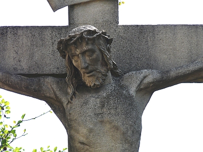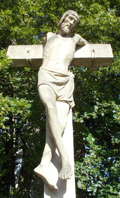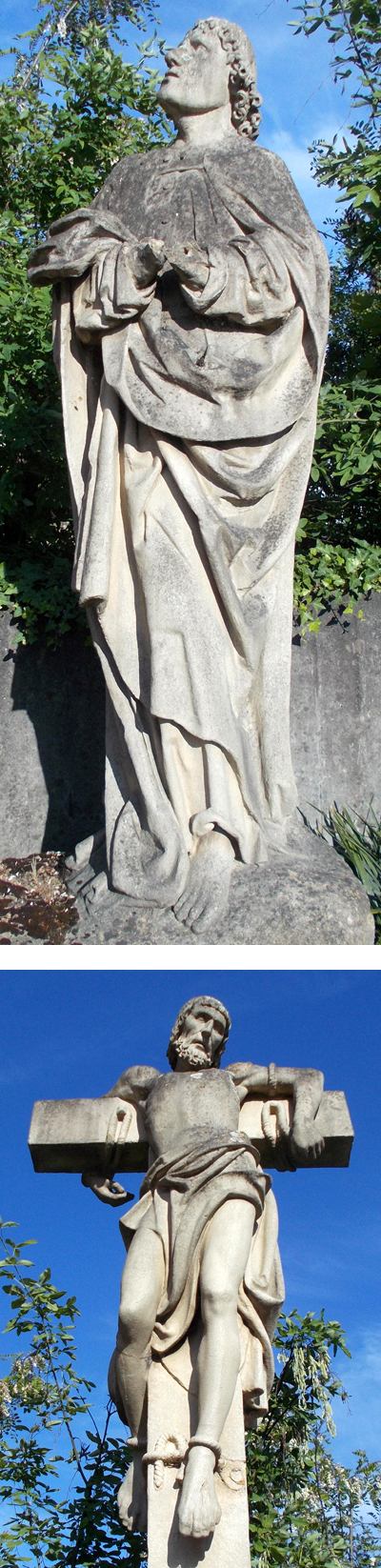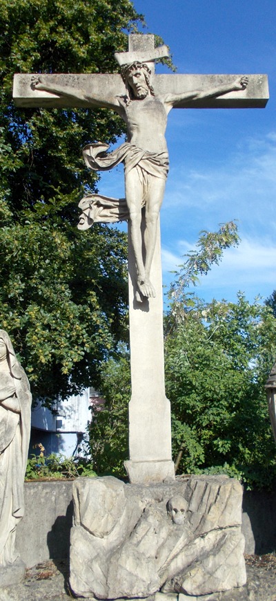 [...] Ausser dem Westflügel ist nur noch die schöne Kreuzigungsgruppe erhalten, welche die schon mehrfach genannte, hochherzige Frau des Bürgermeisters Nic. Zervinus, Adelheid von Besselich, 1498 gestiftet hat. Aus den drei Gekreuzigten, Maria und Johannes bestehend, befindet sie sich an der Stelle, wo früher der Westgiebel der Abteikirche stand.