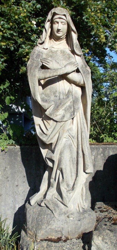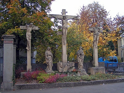 [...] im Jahr 1498, ist der noch heute bei Sankt Martin bestehende Kalvarienberg durch Schenkung Adelheids von Besselich entstanden. Am Kreuz rückwärts ihr Wappen, vor die Inschrift, die besagt, daß die Gruppe 1498 errichtet, benediziert und mit Ablässen versehen worden ist. Die Figuren sind bis auf den linken Schächer ursprünglich, doch restauriert (Bildhauer Stracke). Die Gruppe stand, nachdem die Abteikirche 1894 niedergerissen war, noch bis zum 1. Mai 1816 an ihrem Ort, dann wurde sie an die Sankt-Nikolaus -Kapelle in Zurlauben gebracht, kam aber im Mai 1819 an die alte Stelle zurück. [1]