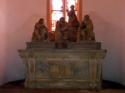 […] Die jetzige Mensa, ein nach unten sich einschrägender Steinaufbau in Sarkophagform, mit klassizistischen Ornamenten, ist wahrscheinlich unter Bischof Mannay um 1810 angefertigt. Das Veronikabild auf der Vorderseite erklärt sich aus der Bestimmung der Krypta als Schauplatz der Karfreitagsliturgie. Ein hinter der Mensa an der Ostwand der Apsis stehender portalähnlicher Aufbau in klassizistischen Formen muß wohl zur Aufnahme des "Heiligen Grabes" bestimmt gewesen sein. – Die Mensa steht an der Stelle des mittelalterlichen Marien-Helenen-Altars. [2]