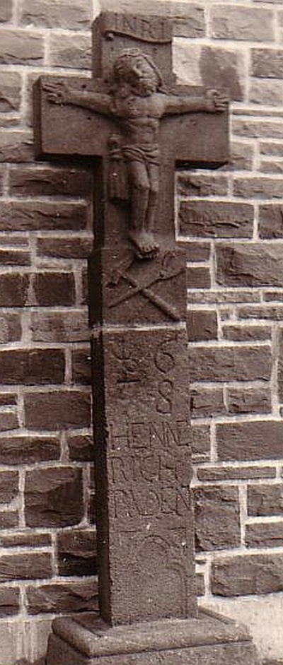 Oberhalb der Schrift hat der Steinmetz einen gekreuzten Hammer und Zange dargestellt, was darauf hindeutet, dass es sich bei dem Stifter Heinrich Roden wohl um einen Schmied gehandelt hat. Das Kreuz stand früher außen an der kleinen Kapelle [ehemalige Quirinus-Kapelle] und wurde bei deren Abriß an die Pfarrkirche versetzt.
