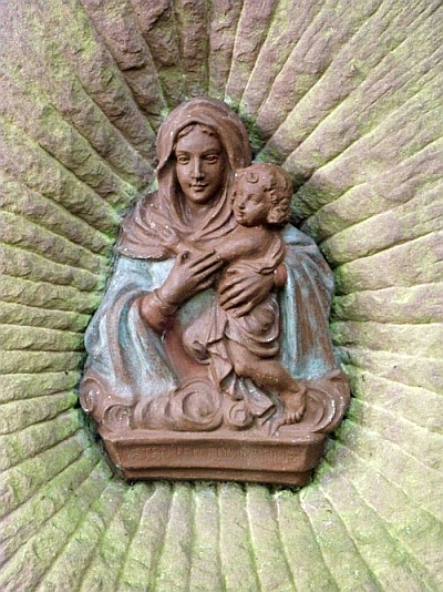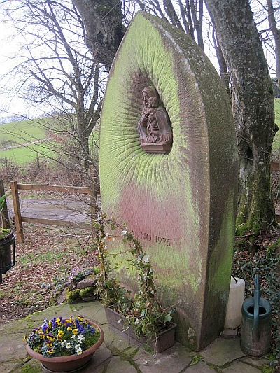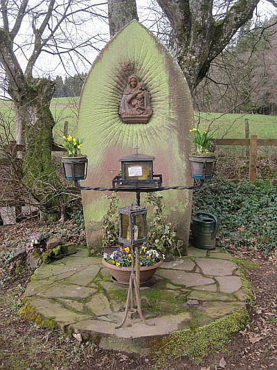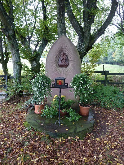 Der Bildstock war aus Birkenholz gebaut und 1967 aufgestellt. Am 12.10.1975 wurde er durch einen 1 m breiten und 2,05 m hohen oval auslaufenden Natursandstein ersetzt. Dieser hat eine eingehauene Nische, darin Maria mit dem Jesuskind.