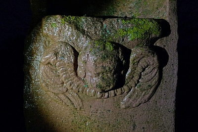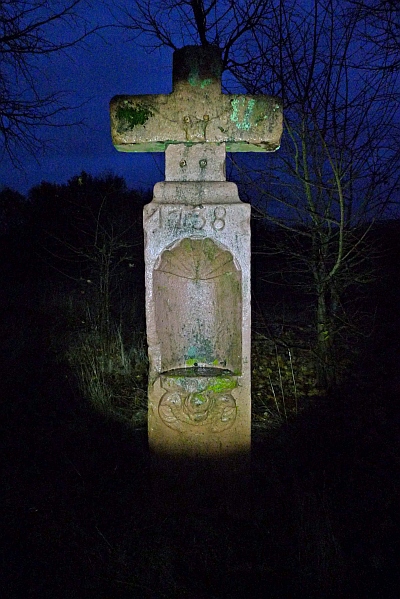 Westlich der Ortslage am Waldrand Wegekreuz, Schaftkreuz, Rotsandstein, bezeichnet 1738. [1]