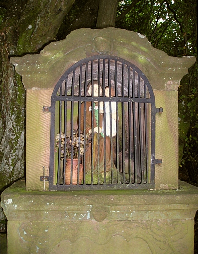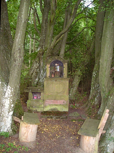 Nördlich der Ortslage am Rand einer bewaldeten Bergkuppe Heiligenhäuschen, Unterbau mit Rokoko-Blattwerk, bezeichnet 1774, Nischenaufsatz, Rest eines Abschlusskreuzes. [1]