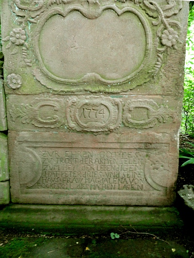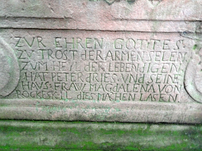 So lautet die Inschrift, eingefasst in einer barocken Kartusche, auf dem untersten Block des vierteiligen Bildstocks, der als Antoniushäuschen den Rockeskyllern und Walsdorfern bekannt ist. Diese Inschrift deutet auf eine Stiftung, auf eine Votivgabe hin. Die Eheleute Dries, deren Initial durchgängig demütig in Kleinbuchstaben gehauen ist, haben den Bildstock einer religiösen Tradition folgend errichten lassen. Der Trost der armen Seelen bedeutete die Fürbitte des Seelenheils der Verstorbenen im Fegefeuer, die dem Genugtuungsleiden, das erleichtert werden sollte, unterworfen waren, wie es seit dem Mittelalter Bestandteil der katholischen Glaubensvorstellung entsprach. Gleichzeitig werden die Lebenden mit einbezogen. Die Stiftung des Bildstocks ist gleichsam eine Vorsorgeleistung, ausgerichtet auf das Jenseits. Das Stifterpaar schließt mit der eigenen Vorsorge alle Lebenden mit ein. So wird die persönliche Stiftung eine Stätte für alle. Peter Drieß wurde am 28. Oktober 1721 als Sohn der Eheleute Leonard Drieß und Anna NN in Rockeskyll geboren. Mit seiner Ehefrau Magdalena Surges hatte er ab 1756 bis 1769 sechs Kinder. Peter Drieß starb 1803. Mit dem sogenannten Antoniushäuschen wurde 1774 der erste eigentliche Bildstock in die Flur gesetzt, der nicht mit den Nischenkreuzen zu verwechseln ist, die nach Abflauen der Flur- und Sakramentsprozession eine Umwidmung in "Bildstöcke" erlebten. Über dem kräftigen Block, der die Inschrift trägt, liegt ein nächster, um zwei Drittel schmalerer Block, auf dem sich, ebenfalls in einer Kartusche, die Jahreszahl befindet. Flankiert wird diese von zwei weiteren Kartuschen, deren Zierleisten nach innen offen sind und nach außen in einem Blattornament enden. Der darüber liegende Sandsteinblock trägt die Konsolplatte des Nischenaufbaus. Unter der profilierten Platte blickt ein geflügelter Puttenengel nach vorne. Der Block ist durch eine Kartusche mit leerem Schild verziert, um den Rahmen sind Rosen stilisiert. Die Nische wird durch eine Art Wellengiebel mit Rundbogen abgeschlossen, in dessen Scheitelpunkt wiederum ein Puttenkopf eingearbeitet ist, über dem eine jetzt zerstörte Kreuzbekrönung mit Corpus aufragt. In der Nische des Bildstocks oder Heiligenhäuschens steht eine nach Herkunft und Arbeit unbekannte Plastik des Hl. Antonius. Durch die ihr beigegebenen Attribute (Kutte, Lilie, Jesus als Kind) weist sich diese Statue als die des Franziskaners, Predigers und Kirchenlehrers Antonius aus, der 1231 in Arcella bei Padua gestorben ist. Da die Flurbezeichnung "Unter dem Heiligen Antonius" in der Flur 2 der Rockeskyller Gemarkung recht alt ist, wird die Antoniusstiftung des Bildstocks die ursprüngliche sein. [3]