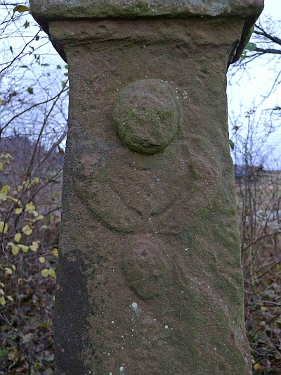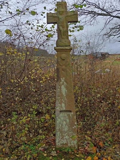 An einem Wirtschaftsweg südwestlich der Ortslage Wegekreuz, Schaftkreuz, Rotsandstein, bezeichnet 1775. [1]