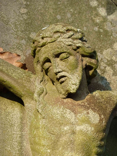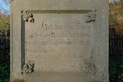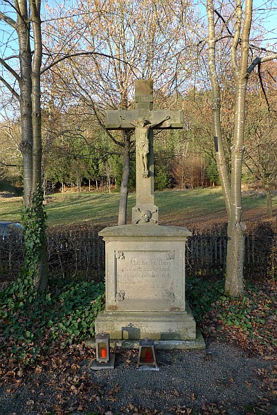 Auf dem Friedhof nordöstlich der Ortslage Friedhofskreuz, altarartiger Unterbau, neugotisches Abschlusskreuz, um 1900. [1]