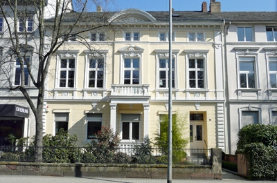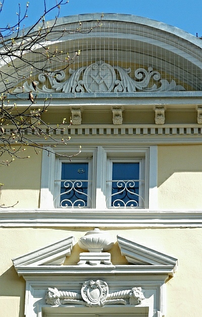 Das Erdgeschoss durch Lagerfugen als Sockel interpretiert, die großen Fenster des Hauptgeschosses über reliefiertem Brüstungsfeld und mit waagrechter Verdachung über einer Sturzzier aus liegenden Füllhörnern. Vorgartenzone mit niedriger Mauereinfassung erhalten.