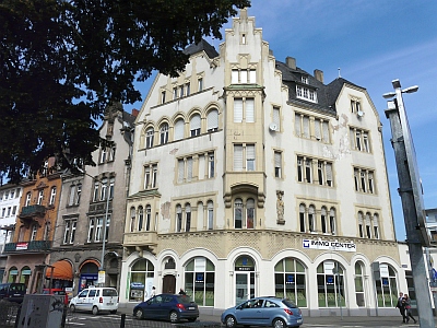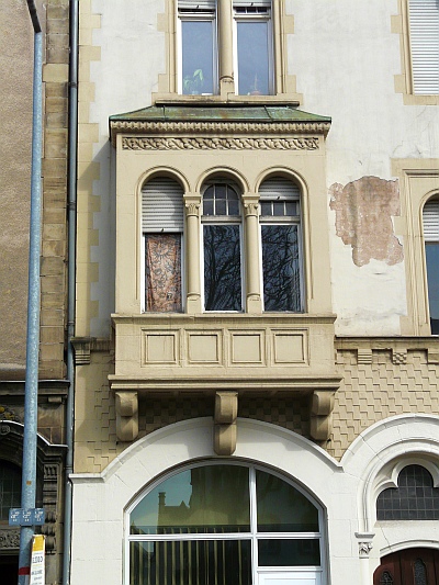 Neben dem Eckerker eine Figur des Trierer Wappenheiligen Sankt Peter unter Baldachin, am Sockel des Erkers vermerkt Entstehungsdatum und die Architektennamen, weiterhin HEINRICH SCHÜLLER, GEFALLEN 1914 und die Todesdaten von Arnold Schüller und Regina Singer 1922. [1]