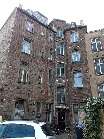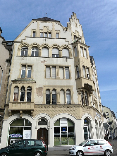 Viergeschossiges repräsentatives Etagenmietshaus, das die stumpfe Ecke zur Petrusstraße einnimmt, 1905 nach Plänen der Architekten Julius Reinhold Wirtz und Wilhelm Schmitz, des damaligen Dombaumeisters, vom Baumeister August Wolf für den Marmorbildhauer Arnold Schüller auf dessen Betriebsgelände erbaut.