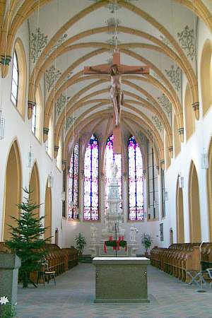 Bänke und Chorgestühl stammen wurden um 1881 im neugotischen Stil vom Trierer Kunstschreiner Koch angefertigt. Der Chorraum der Apsis wird seit der Renovierung von dem Marien-Votivaltar beherrscht. Er stand vorher im Vorhof des Kolleggebäudes der Jesuiten, wo sich jetzt ein Abguss befindet. Er entstand 1726/27 und wird bekrönt von einer Marienstatue mit Kind, die sich dem in der Barockzeit beliebten Typus Immaculata zuordnen lässt. Vor allem sie wird dem aus Hadamar stammenden Bildhauer Johann Neudecker d. J. (*1692) zugeordnet. Erwähnenswert ist ebenfalls der sich an der Südseite der Apsis befindliche Epitaph der Luxemburger Prinzessin Elisabeth von Görlitz (1390-1451) aus der Mitte des 15. Jahrhunderts