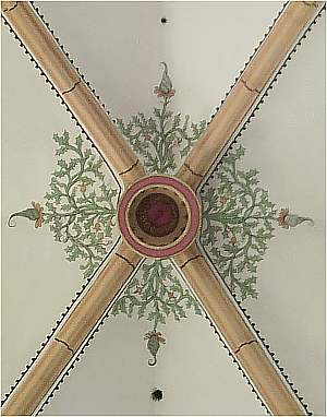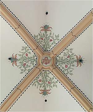 Die Kapitelle der Säulen tragen lebhaftes dunkelgrünes Blattwerk, auf der südlichen Seite darüber hinaus Blütenmotive. Die Ausmalungen der Decke zeigen Blumenbemalungen in den Gewölbejochen sowie Feuerbemalung in den Scheidebögen. Zu erwähnen sind auch die Gewölbeschlusssteine: im Mittelschiff Rose, Krone, Vierpaß mit Rosette und das Lamm Gottes, im nördlichen Seitenschiff Wappen von Luxemburg und Böhmen, im östlichen Seitenschiff Mariensymbole.