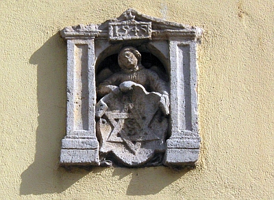 Hausmarke aus hellem Sandstein über der Haustür des modernisierten Wohnhauses. Unter einer Ädikula mit der Jahreszahl 1545 im Dreiecksgiebel Figur, die das Wappenschild mit einem Hexagramm um das Monogramm IS hält. Sie weist auf Johannes von Sierck, den 1548 verstorbenen Dekan des Stifts in Pfalzel und damit auf den Hof des Stifts. [1]