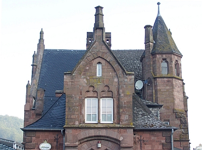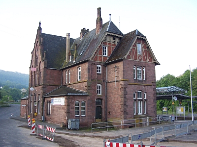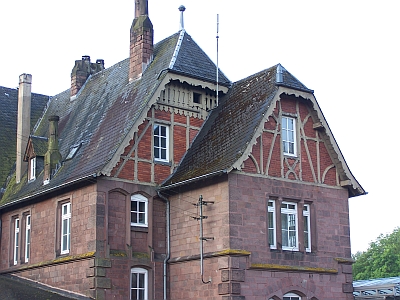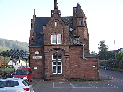 Das pittoreske Gebäude aus roten Sandsteinquadern liegt zwischen Gleisanlage und Mainzer Straße.