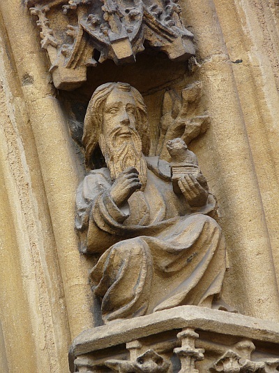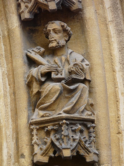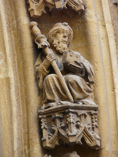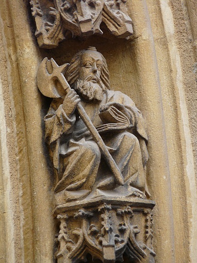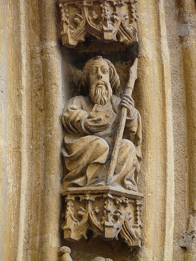 Hinzuweisen ist auf das hochgotische Westportal mit Spitzgiebel und dahinter liegender Rosette. […] Bislang nahm man eine Entstehung des Westportals im Verlauf des 15. Jahrhunderts an; aufgrund von stilistischen Ähnlichkeiten mit dem Kreuzgang des 1310 fertiggestellten Franziskanerklosters in Metz diskutiert man mittlerweile auch eine Entstehung im 14. Jahrhundert. Die Archivoltenfiguren zeigen im Scheitel Gottvater oder Christus in Wolken, rechts und links von ihm in der Leibung sitzend die zwölf Apostel. Die Figuren in den Nischen und im Giebelfeld fielen vermutlich den Zerstörungen im Zuge der Französischen Revolution zum Opfer. [1]