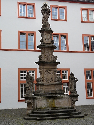 Der Votivaltar präsentiert zur Schauseite hin barocken Reliefschmuck: er erhebt sich über einem Postament in drei volutenbesetzten Geschossen. Der Pfeiler ist in obeliskenartiger Form über einem dreieckigen Grundriss errichtet und wird von einer Marienstatue mit Kind bekrönt.