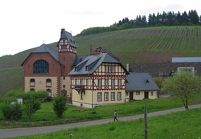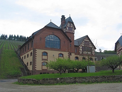 Baugruppe aus Kelterhaus, Abfüll- und Lagergebäuden und Wohnhaus. Die Aufgliederung in verschieden gerichtete und verschieden hohe Gebäude einschließlich eines Turmes, die mit Putzflächen, Sichtbackstein und Zierfachwerk und unterschiedlichen Dachflächen mit Walmen und Gaupen gestaltet sind und die der Bautengruppe einen burgartigen mittelalterlichen Charakter verleihen, entspricht dem historistisch-romantischen Ideal der Jahrhundertwende.