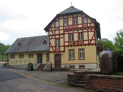 1900-1909 vom preußischen Staat als Musteranlage für Weinbau und Weinlagerung im Aveler Tal am Fuße der Weinberge nach Plänen des Trierer Kreisbauinspektors Jaffke errichtet. Mit 19 ha Anbaufläche war die Domäne Avelsbach die größte der drei Weinbaudomänen (neben Ockfen und Serrig), die der preußische Staat unter besonderer Förderung von Prof. Hugo Thiel seit 1896 zur Förderung des Weinbaus an der Mosel auf früherem forstfiskalischen Lohheckenland anlegte. (Gleichzeitig entstanden die Kelleranlagen in der Sichelstraße 6) Renovierungsarbeiten seit 1990.