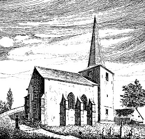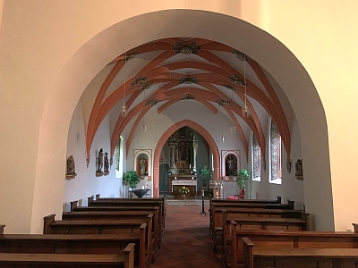 Malerische Gruppe, bestehend aus dreiachsigem spätgotischem Schiff und abknickendem Chor, eventuell älterem Ostturm sowie querhausartiger Westerweiterung, 1926/27; zwei Grabsteine, 19. Jahrhundert. [1]