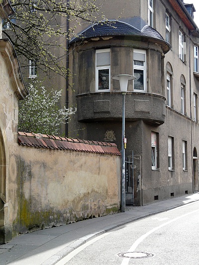 An der linken Hausseite ist, wohl als spät verbaute Spolie, ein Relief mit einer Figurengruppe (Taufe ?) im Strahlenkranz angebracht. Die mit Rollwerk umgebene Kartusche zeigt die Umschrift