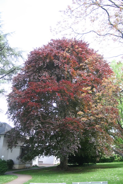 Die Blutbuche ist eine Mutation der Rot-Buche, bei der die Epidermisschicht des Blattes nicht durchsichtig ist und somit die grüne Farbe des Chlorophylls nicht sichtbar wird. Im Laufe des Jahres vergrünt die Blutbuche, sodass sie zum Herbst kaum noch von der Rotbuche zu unterscheiden ist. Die Buche wäre in der natürlichen Vegetation der häufigste Baum in Zentraleuropa. Die Germanen verehrten den Baum als Gottheit und ritzten ihre Runen Schriftzeichen in Buchenstäbchen, von dieser Nutzung leitet sich unser heutiger Begriff der Buchstaben ab. [3]