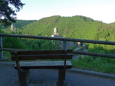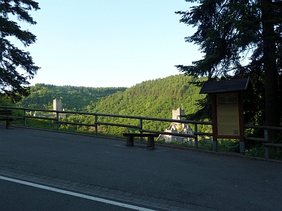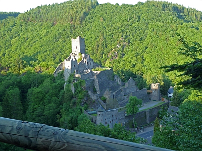 Vor Ihnen liegt das grandiose Manderscheider Burgenpanorama der zwei auf steilem Felsen hintereinandergestaffelten Ruinen der Ober- und Niederburg, einer der eindrucksvollsten Anblicke mittelalterlicher Wehrarchitektur, die sich in Deutschland finden lassen. Zugleich stellen diese beiden Burgen eine martialische Variation des bekannten Themas dar: dem Kampf um die Macht in der Eifel zwischen den sie umgebenden Großterritorien, hier zwischen Trier und Luxemburg, denn die Lieser, die die beiden senkrecht abstürzenden Burgfelsen trennt, war die Grenze zwischen den beiden Fürstentümern. Die Oberburg und die Ortschaft Manderscheid gehörten zum Kurfürstentum Trier, die größere Niederburg mit der stark befestigten Talsiedlung Niedermandeischeid zu Luxemburg. So haben sich die Wächter auf den beiden gegenüberliegenden Turmriesen jahrhundertelang misstrauisch ins Auge geblickt- und das mit gutem Grund.(aus: DuMont Kunstreiseführer "Die Eifel") [1]