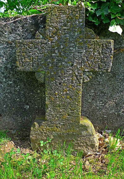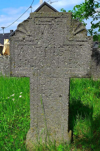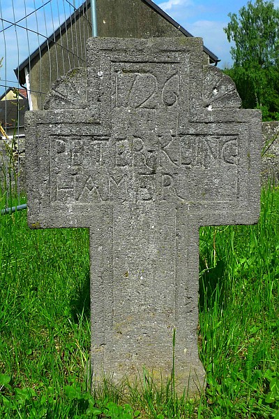 [...] Bei einer Neugestaltung der Friedhofsanlage vor einigen Jahrzehnten wurden neun alte Grabsteine und ein hohes Schaftkreuz wieder neu aufgestellt. Bis auf zwei Grabkreuze sind sie alle gut erhalten und die Inschriften gut lesbar.