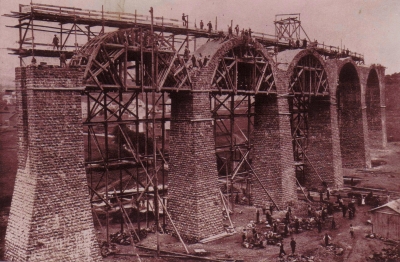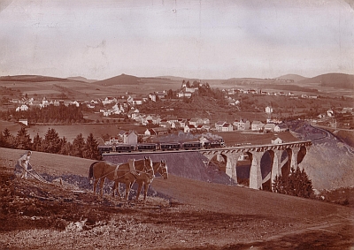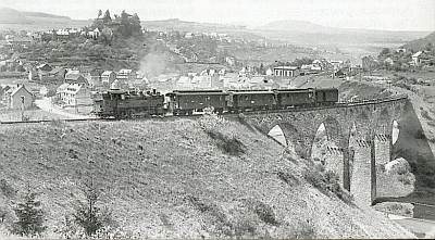 Für die Bahnlinie Daun - Wittlich musste kurz hinter dem Bahnhof Daun 1907 - 08 ein eingleisiger Eisenbahnviadukt erbaut werden. Die Bauarbeiten führte die Firma Hochtief Frankfurt aus. Die 5-bogige Brücke aus Eifeler Basalt hat eine Länge von ca. 103 m und ist 30 m hoch. Die Spannweite der Bögen beträgt 16 m; die Baukosten machten 141.000 Mark aus.
